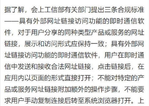會上,工信部提出有關即時通信軟件的合規標準,要求限期內各平臺必須按標準解除屏蔽,否則將依法采取處置措施。