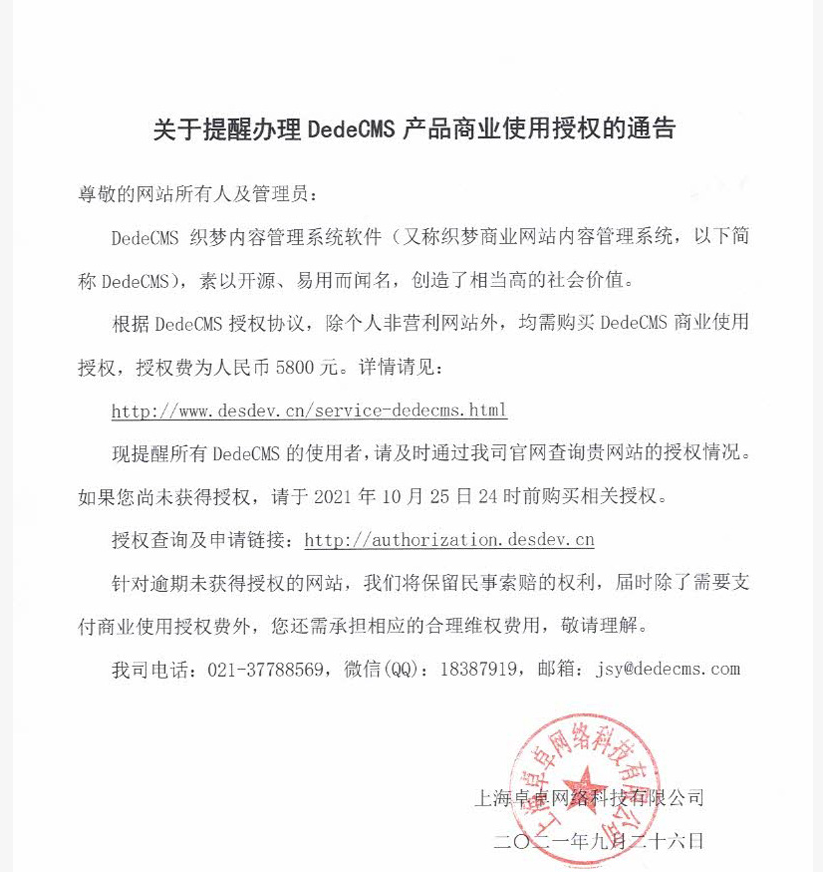 現提醒所有DedeCMS的使用者,請及時通過我司官網查詢貴網站的授權情況。如果您尚未獲得授權,請于2021年10月25日24時前購買相關授權。