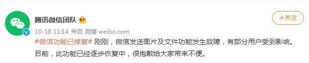 騰訊微信團隊 10月18日稱,剛剛,微信發送圖片及文件功能發生故障,有部分用戶受到影響。目前,此功能已經逐步恢復中,很抱歉給大家帶來不便。